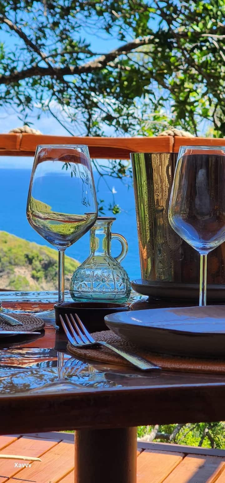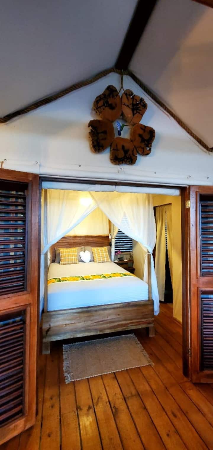 Indulge in the romantic ambiance of this Canopy Hideaway, a unique retreat where rustic charm meets modern comfort. Enjoy breathtaking views of the Caribbean Sea and neighbouring island . Immerse yourself in the tranquility of swaying trees and the melody of crashing waves .Let the symphony of nature from the gentle rustle of leaves to the chorus of birdsong, lull you into tranquility ! Come and experience an unforgettable retreat in our KaiZen TreeHouse .